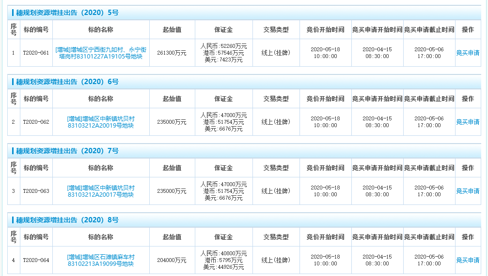 今日(4月15日),增城一口气挂牌出让4宗地的国有土地使用权,分别位于增城宁西街、中新镇坑贝村、石滩镇,并均计划于5月18日10时起竞价出让,起拍总价达935300万元。