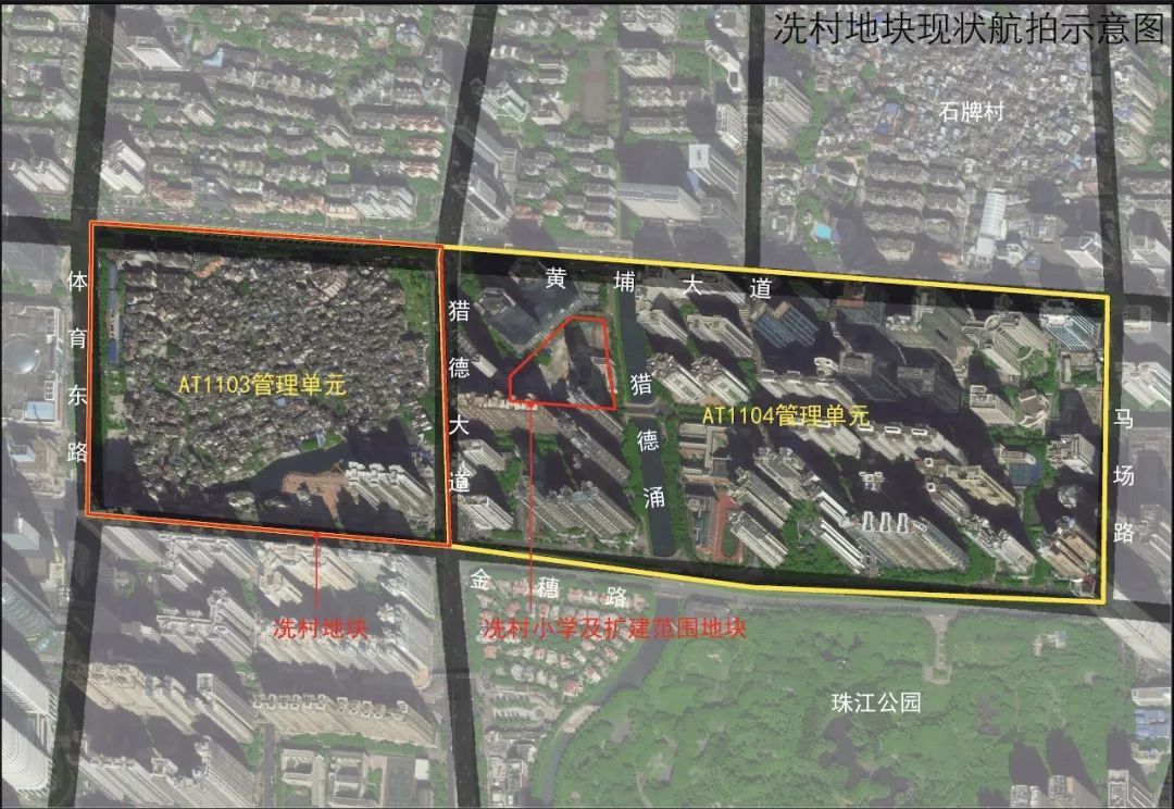 冼村改造地块,位于天河区西部,控规修改范围包括冼村路以东,黄埔大道以南,猎德大道以西,金穗路以北的冼村地块(25.35公顷,380.25亩),以及东侧冼村小学及周边拟扩建地块(1.63公顷,24.45亩),合计规划调整范围面积27公顷,涉及AT1103与AT1104规划管理单元。