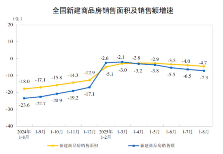 国家统计局9月15日发布数据显示,1-8月全国房地产开发投资约6.03万亿元,同比下降12.9%;新建商品房销售额5.50万亿元,同比下降7.3%。尽管多项指标仍处于下降趋势,但商品房待售面积已连续6个月减少,市场去库存成效显现。