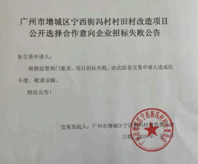 其实,早在7月1日宁西街冯村村委会就在广州公共资源交易中心官网发布称“根据监管部门要求,该村旧改项目招标失败”。