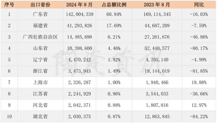 陶瓷资讯根据海关统计数据分析,2024年8月,出口前十的省(市)中,仅上海和河北相较去年同期实现了增长,其余省(市)均有下滑。2024年8月,广东省陶瓷砖出口额占出口总额的60.84%,相较去年同期下降16.03%。
