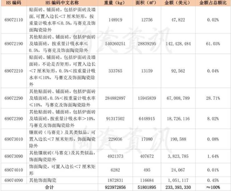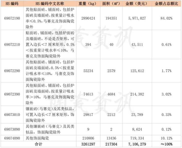 1、陶瓷砖出口类别统计