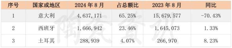 2024年8月,我国陶瓷砖进口前三国家是意大利、西班牙和土耳其,其中意大利进口瓷砖同比下降70.43%,西班牙和土耳其进口瓷砖相较去年同期分别上升1.33%、8.23%。