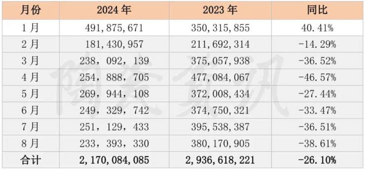 根据海关相关数据统计:2024年8月份,我国陶瓷砖进出口总额为2.40亿美元,同比下降39.61%;其中,出口总额为2.33亿美元,同比下滑38.61%,陶瓷砖进口总额为710.63万美元,同比下降60.68%。