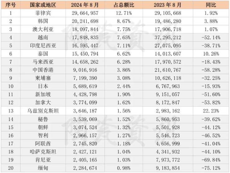 2024年8月,我国陶瓷砖出口前二十的国家和地区占出口总额的79.59%。值得一提的是,出口前二十的国家和地区中,仅菲律宾、韩国、澳大利亚、泰国、乌兹别克斯坦相比去年同期实现了增长,其余均下滑。