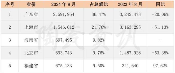陶瓷资讯根据海关相关统计分析,2024年8月,我国陶瓷砖进口额前5位的省(市)分别是广东、上海、海南、北京和福建。2024年8月进口瓷砖总额最高的地区是广东,占总额比为36.47%,但相较去年同期下滑20.06%。
