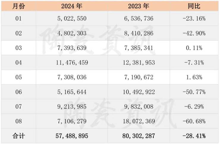 陶瓷资讯根据海关统计数据分析,2024年8月,我国陶瓷砖出口总额为2.33亿美元,同比下滑38.61%;按人民币计算,2024年8月,我国陶瓷砖出口16.64亿元, 同比下降38.83%。(ps:此处美元计与人民币计,涨跌幅度有出入。)