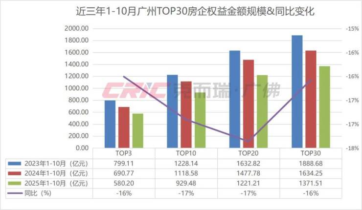 因成交规模较去年同时期回落明显, 克而瑞数据监测显示,2025年1-10月权益金额TOP30房企业绩规模1371.51亿元,同比减少16%。