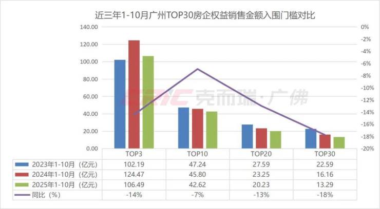 入围门槛方面,克而瑞数据监测显示,2025年1-10月权益金额TOP3梯队房企入围门槛106.49亿元,同比下降14%,高于2023年同时期,TOP10梯队房企入围门槛42.62亿元,同比下降7%;TOP20梯队房企入围门槛20.23亿元,同比下降13%;TOP30梯队房企入围门槛13.29亿元,同比下降18%。