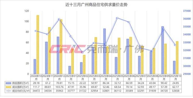 广州方面,克而瑞数据监测显示,经历了9月楼盘密集取证之后,10月供应放缓,商品住宅取证面积24.85万㎡,环比减少73%,同比减少12%,成交面积62.17万㎡,环比增长8%,同比减少44%。成交量同比大幅减少,主要是去年10月恰逢广州全域解限,需求集中释放,而今年广州政策环境平缓,不及去年高基数也是情理之中。价格方面,10月全市商品住宅成交均价为32658元/㎡,环比结构性下跌6%,同比结构性下跌5%。