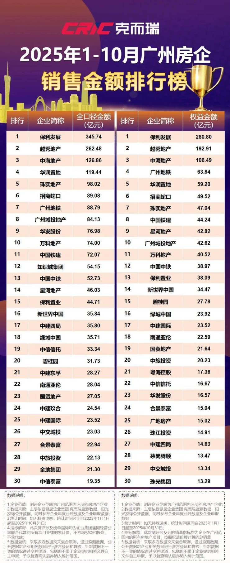 克而瑞广佛区域公布《2025年1-10月广州房地产企业销售榜TOP30》,为大家揭开谜底。