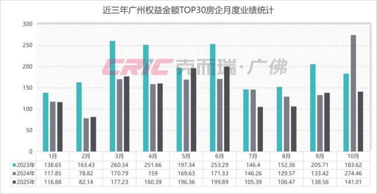 其中10月权益金额TOP30房企业月度业绩141.01亿元,环比增长2%,同比接近腰斩。