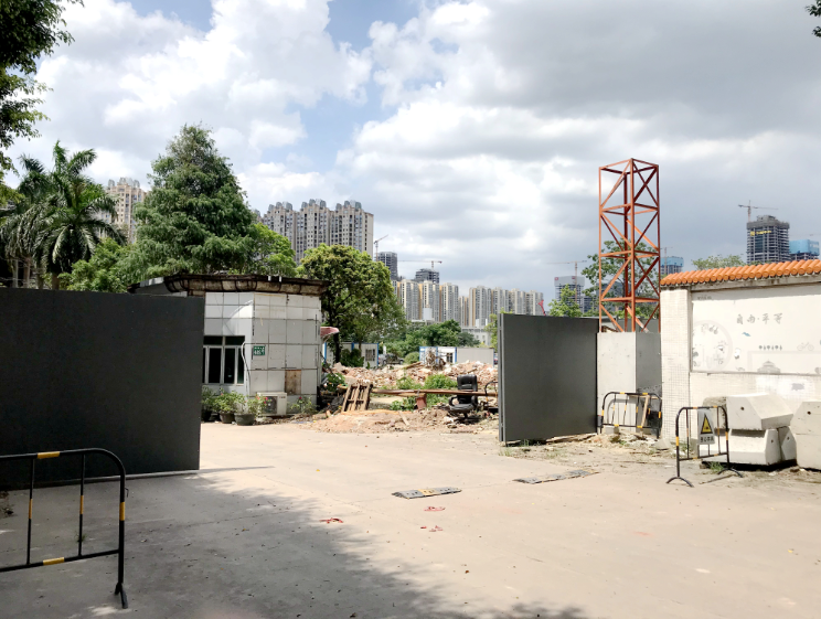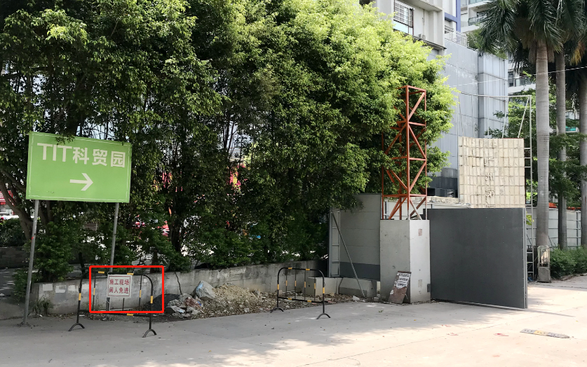 从8号线赤岗地铁口出来,步行不到400米即到达合生国际广场地块,目前地块靠近马路边缘有外墙围蔽,大门入口处均有栏杆和停车费说明,并举告示:施工现场 先人免进。