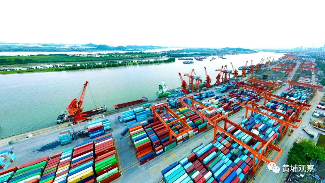 这一片狭长区域,也是黄埔港的所在地。行走其间,放眼望去集装箱整齐地堆放着,驳船载着一些集装箱缓缓驶来。