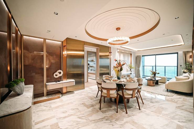 耀胜尊府推出的胜景平层产品,以其创新的五空间布局突破了传统户型的局限。全景落地窗不仅是采光与通风的通道,更成为连接室内外景致的画框,将长隆的自然生态与城市繁华天际线一并纳入日常视野。