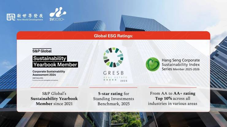 在日前香港恒生指数公司(Hang Seng Indexes)公布的“恒生可持续发展企业指数”评级结果中,新世界发展有限公司评级由AA级跃升至AA+级,跻身全市场前10%,并于环境、社区参与和发展、消费者议题及企业治理等多个范畴表现突出,这一成果充分体现了新世界集团在环境、社会及管治(ESG)方面的持续进步与长期承诺。