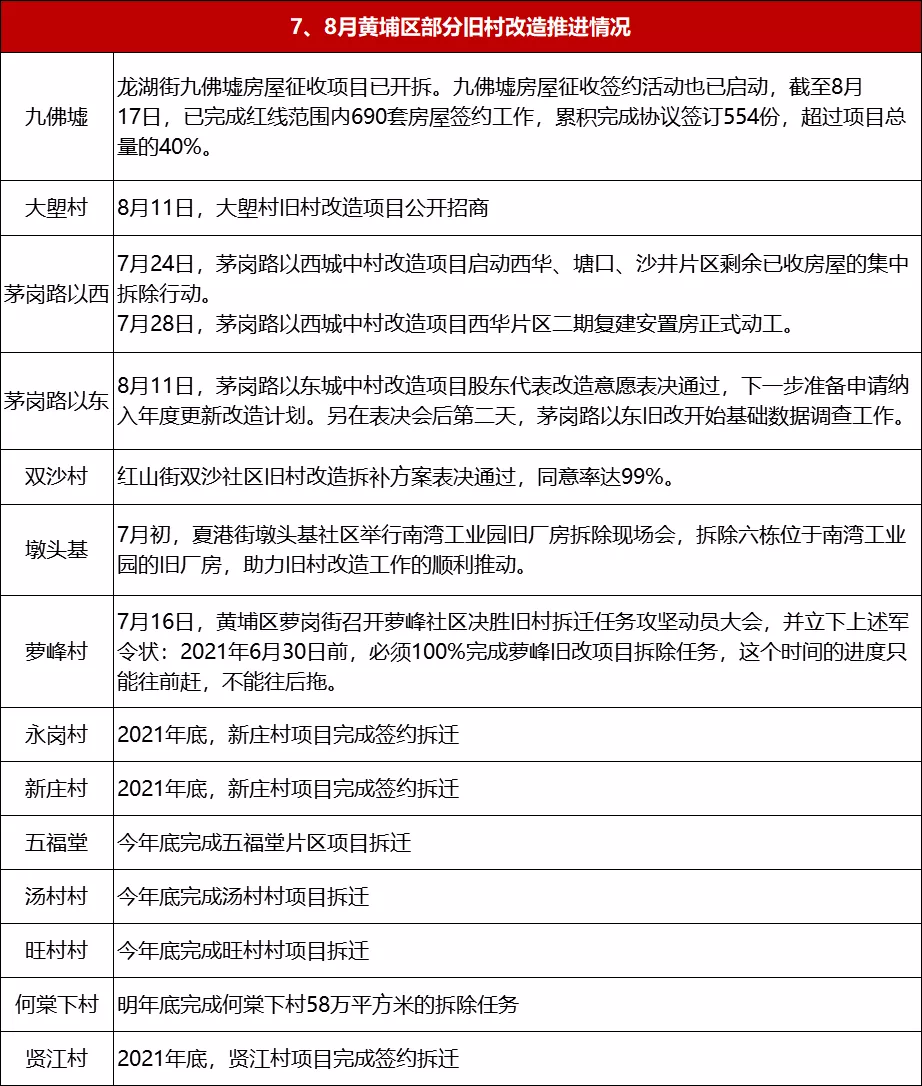 九佛墟、茅岗路以西、墩头基、萝峰村、文冲村等多个旧村改造项目纷纷推进拆除行动,另还有多个旧村改造项目进一步明确拆迁目标等,动作迅速。