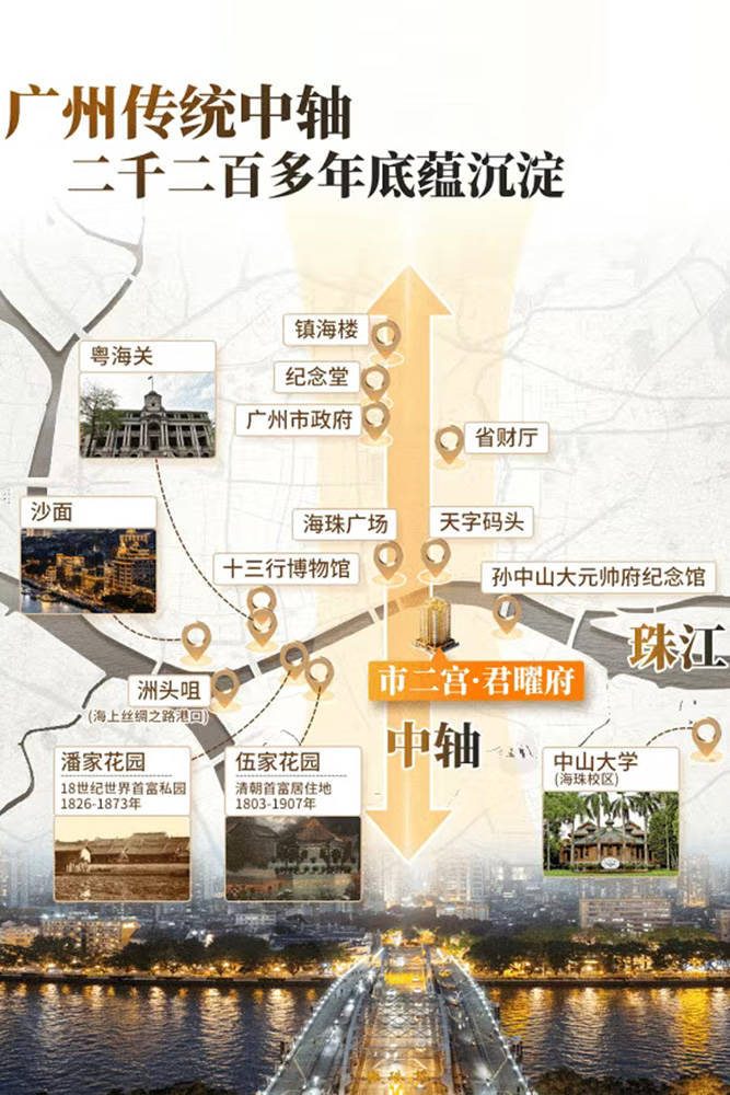 君曜府所在的市二宫板块,是很多老广心中的“白月光”。作为广州千年中轴与珠江前航道的交汇点、海珠区最早成熟的板块之一,这里曾是十三行时期的贸易核心与豪宅发源地,承载着广府文化底蕴与城市发展脉络。