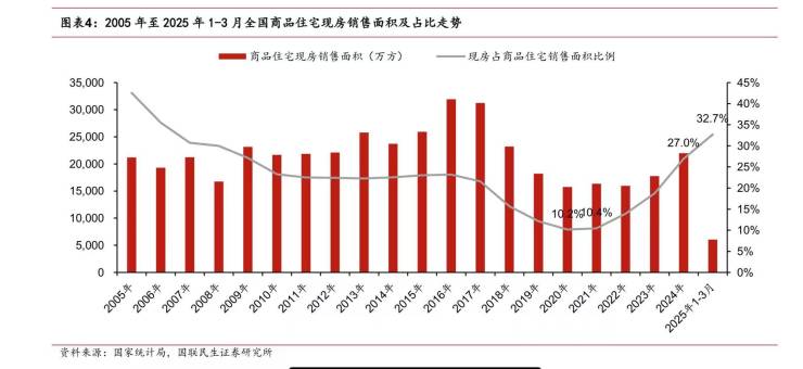 国联民生证券对更长时间范围内的监测数据进一步显示出,2021年以来现房销售占商品住宅销售面积比例呈上升趋势,2025年一季度占比为32.7%,较2020年全年均值提升22.5个百分点,海南等4个省市一季度商品住宅现房销售占比已超五成。