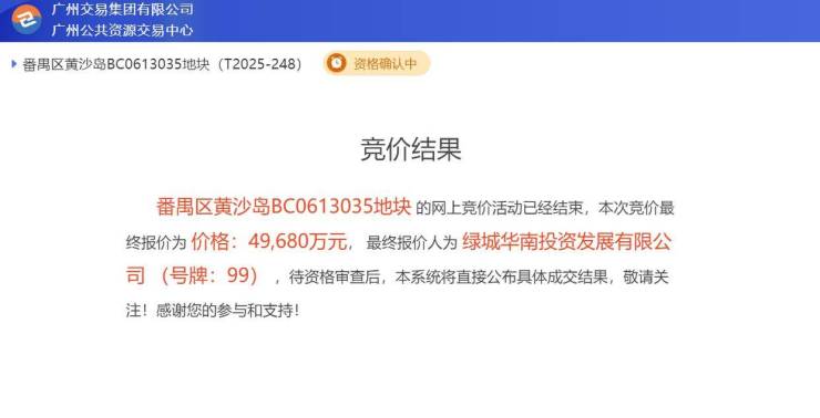 10月21日,番禺区黄沙岛BC0613035地块竞价出让,为绿城以总价49680万元拿下,溢价率约17.8%,折合楼面价2.59万元/㎡。
