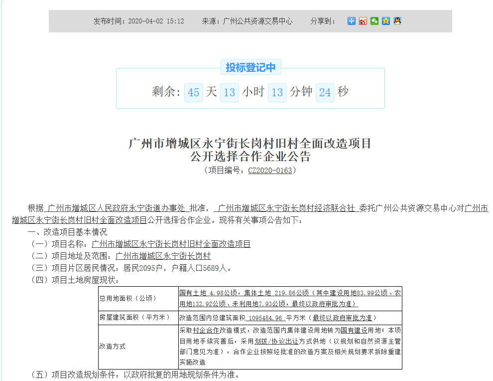 4月2日,增城区永宁街长岗村旧村全面改造项目,正式发出公开选择合作企业公告。