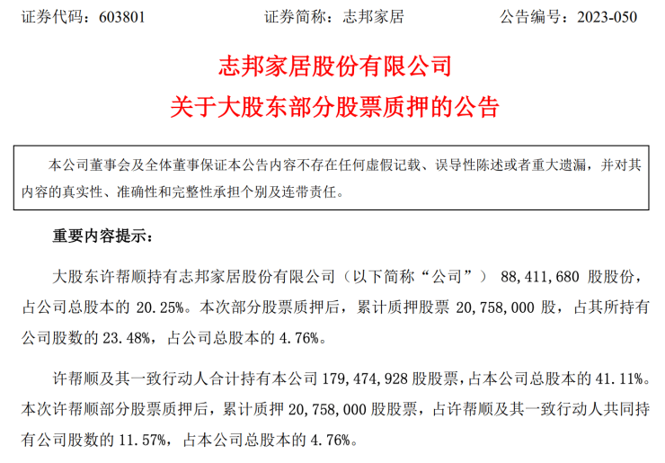 7月24日,志邦家居发布公告称,大股东许帮顺持有志邦家居股份有限公司约8841万股股份,占公司总股本的20.25%。本次部分股票质押后,累计质押股票约2076万股,占其所持有公司股数的23.48%,占公司总股本的4.76%。许帮顺及其一致行动人合计持有公司约1.79亿股股票,占公司总股本的41.11%。