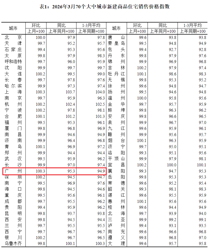 4月16日,国家统计局公布3月份70个大中城市商品住宅销售价格变动情况。