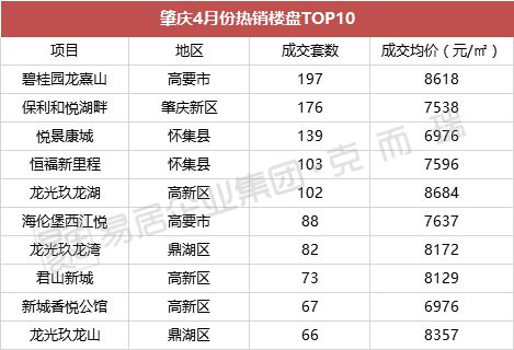 肇庆最热销的楼盘为高要市的碧桂园龙熹山,已经连续两月销量先进,4月成交套数197套,成交均价为8615元/㎡;第二名依旧为3月第二的保利和悦湖畔,成交套数176套,成交均价7538元/㎡;第三名则为怀集县的悦景康城,参加套数139套,成交均价6976元/㎡。