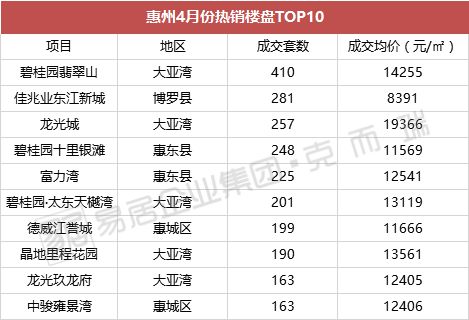 4月份惠州热销楼盘TOP10中,大亚湾占据半壁江山,区域内有5个楼盘入围,其中成绩较好为TOP1的碧桂园翡翠山,成交了410套,遥遥先进于其他楼盘,还有TOP3的龙光城同样来源于大亚湾,成交套数257套;惠城区、惠东县也各有2盘入围;博罗县则有1盘入围,为TOP2的佳兆业东江新城,成交套数281套。