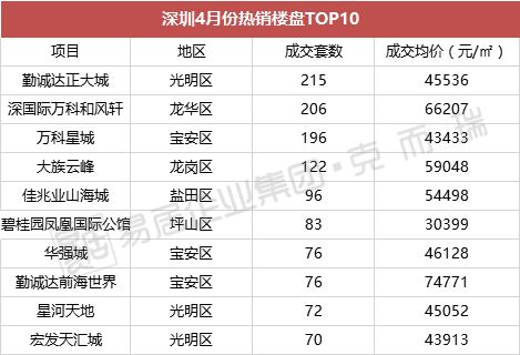 从楼盘看,4月份深圳各区域中,高明区有3个楼盘入围成交套数TOP10;宝安区同样有三个楼盘入围;其余龙华区、龙岗区、盐田区和坪山区则各有一盘入围。