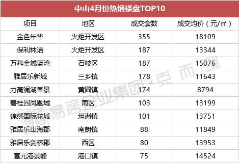 中山4月份热销楼盘中,火炬开发区入围楼盘最多,有2个并且位列TOP1和TOP2,分别为成交了355套的金色年华和成交了187套保利林语。石岐区的万科金域蓝湾成交套数与TOP2持平,不过成交面积则少于保利林语。