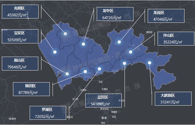 目前深圳房价较低的区域为3字头的大鹏新区和坪山区,成交均价在3.1-3.5万/平之间。