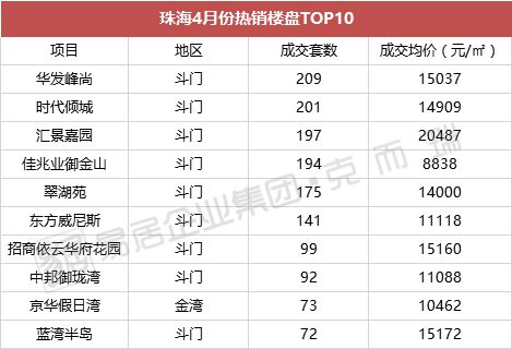 在珠海最热门的置业区域是哪个?不用思考,就是斗门。。。要知道4月的热销楼盘TOP10中,除了一个来自金湾区的京华假日湾外,其余楼盘均被斗门承包了!其中TOP1为华发峰尚,成交套数209套;TOP2为时代倾城,成交套数201套;TOP3汇景嘉园,成交套数197套。
