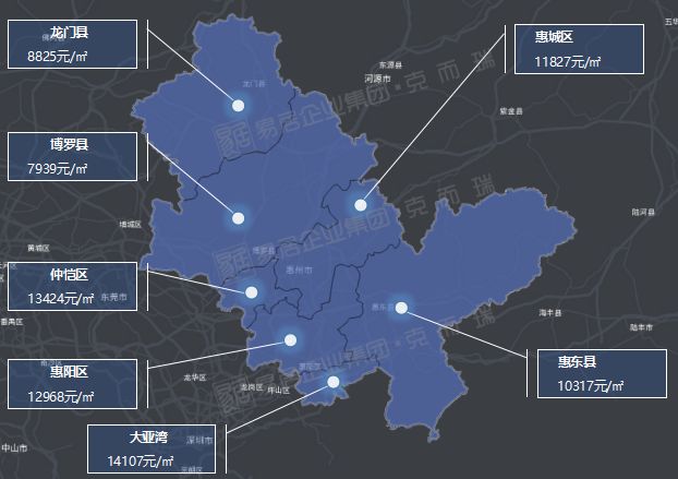 从价格涨跌来看,龙门县、博罗县和惠城区的房价较3月有所下跌,不过跌幅都不高,较高跌幅为龙门县的4%。仲恺区、惠阳区、大亚湾和惠东县房价较3月则有不同程度的上涨,其中仲恺区涨幅最猛,上涨幅度近2000元/平。