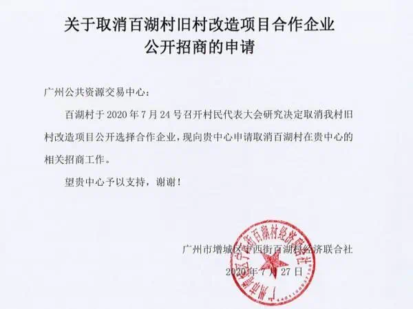 公告显示,百湖村于2020年7月24日召开村民代表大会并决定取消旧村改造项目公开选择合作企业。