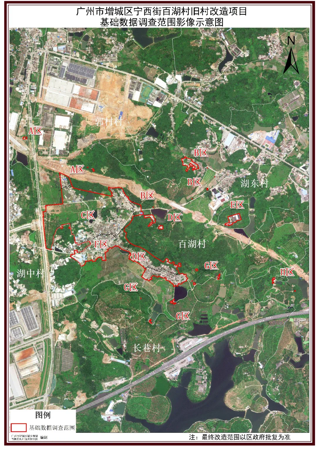 广州市增城区宁西街百湖村旧村改造项目基础数据调查范围公示红线面积861.483亩,现状建筑总量1430栋,建筑总面积为319443.34平方米,建基总面积146381.37平方米,项目改造总成本约为45亿元。