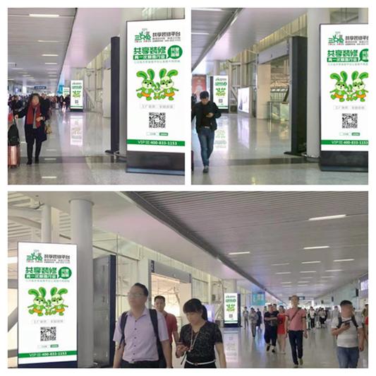 喜欢迎广大来宾三只兔共享装修平台海报刷屏深圳北站,32块广告屏布满整个深圳北站。
