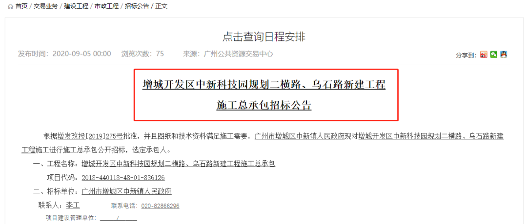 不久前,广州公共资源交易中心挂出了关于增城开发区中新科技园规划二横路、乌石路的新建工程施工总承包招标公告。