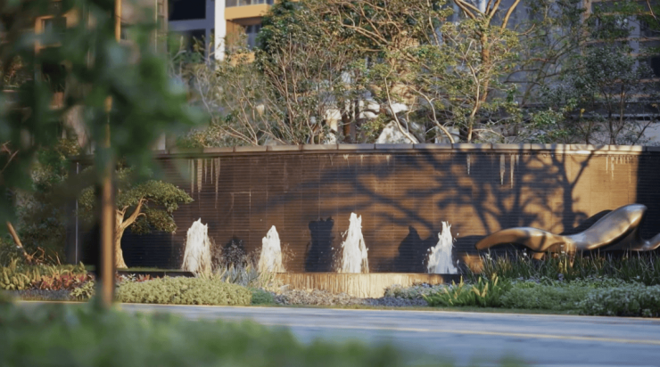 园林的标志性景观「叠水镜流」,取“水为财”的好彩头,层层叠水不断,寓意美好顺遂,在一旁的祥云,则象征福气吉祥;旁侧的名贵罗汉松,豪宅标配的手笔在此彰显。