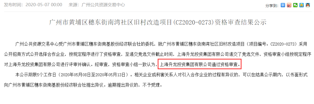 5月7日,广州公共资源交易中心发布“广州市黄埔区穗东街南湾社区旧村改造项目(CZ2020-0273)资格审查结果公示”。