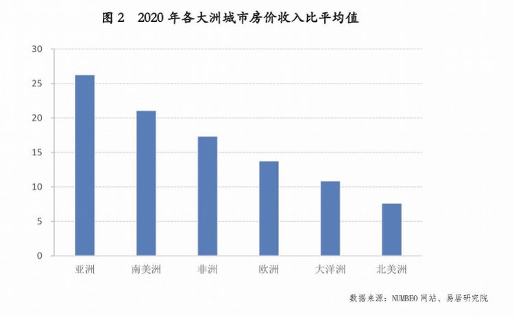 从各大洲城市的房价收入比情况来看,亚洲城市的平均值较高,为26.2,北美洲城市的平均值较低,为7.6。其他各大洲城市的房价收入比平均值分别为,南美洲21、非洲17.3、欧洲13.7、大洋洲10.8。