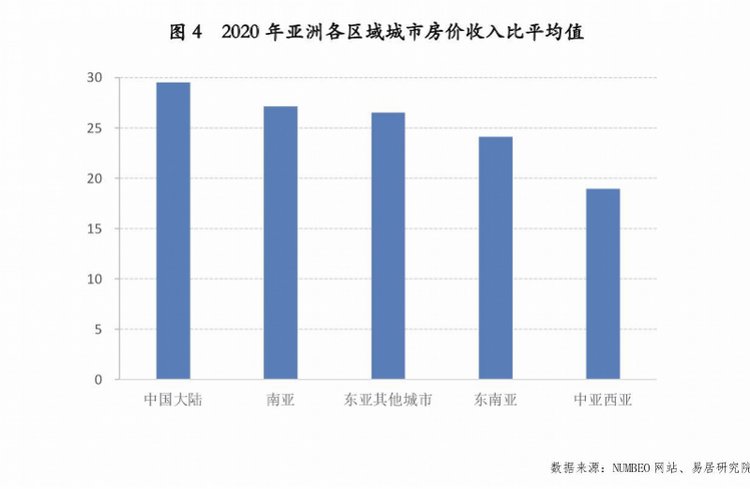 从亚洲各区域城市的房价收入比来看,东亚、东南亚和南亚的城市平均房价收入比均高于20,中亚和西亚地区略低。