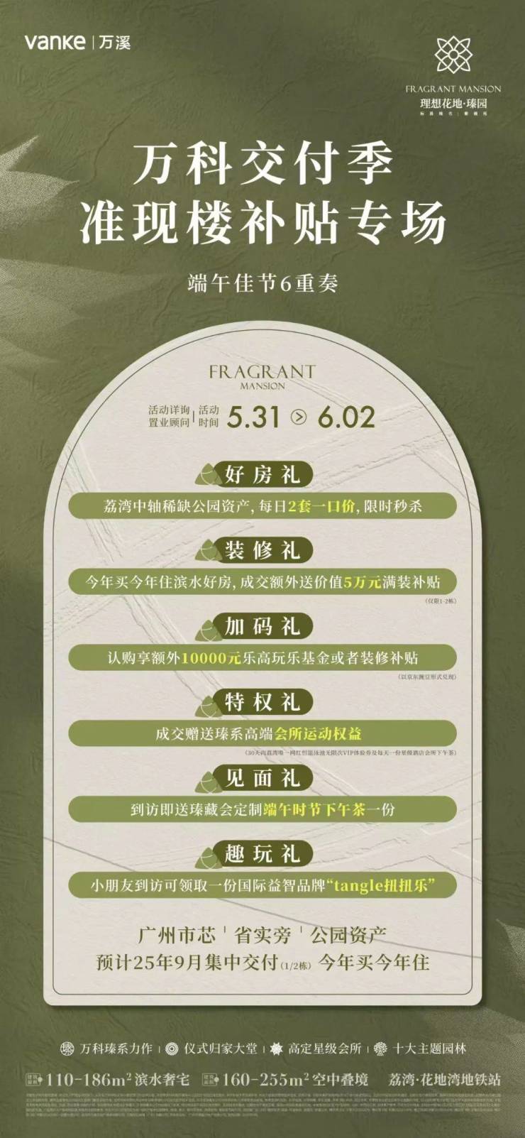 此外,位于花地湾的万科理想花地·臻园则推出准现楼补贴专场,在5.31-6.02期间,推出好房礼、装修礼、加码礼、特权礼、见面礼、趣玩礼活动。其中,在此期间,每日2套一口价秒杀单位,感兴趣的朋友可千万不要错过了!