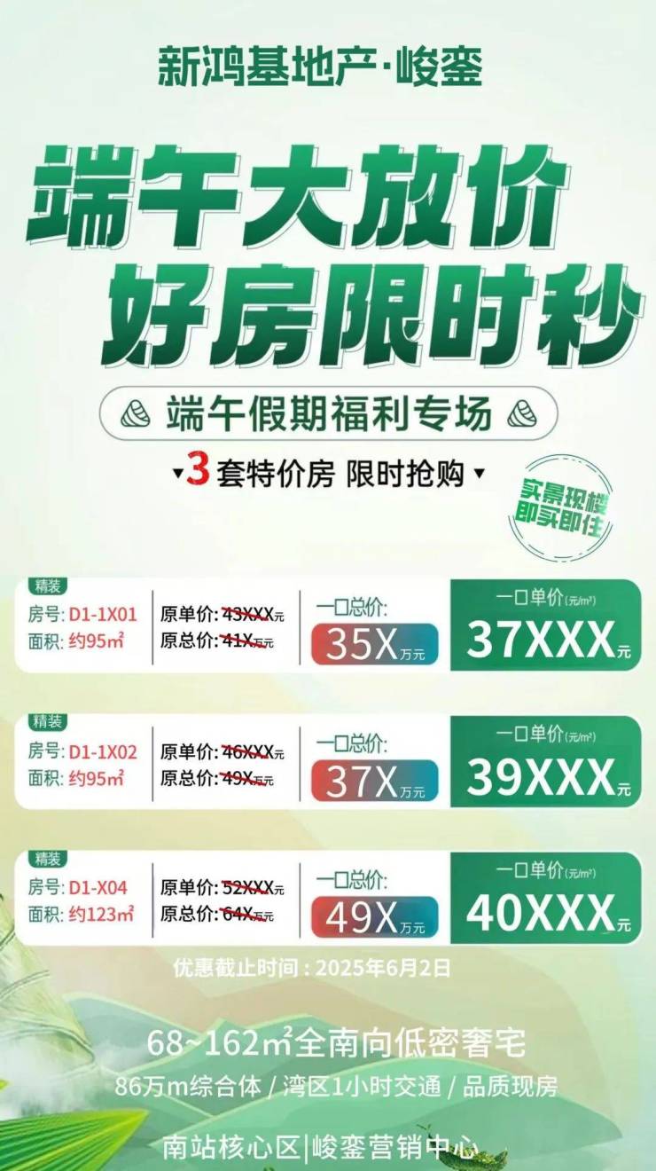 此外,新鸿基地产·峻銮端午推出限时特惠专场:①特价房秒杀价,95㎡三房35X万元,124㎡四房49X万元;②高标现楼,即买即住;③精选单位赠送全屋家私;④来访赠精致下午茶等活动。目前项目在售建面约68-162㎡产品。