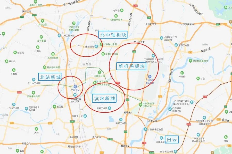 目前花都主要有四个板块:以广州融创文旅城为代表的“北中轴”、主打“广清同城”交通牌的“北站新城”、围绕机场的“新机场板块”、以及位于花都湖畔的“滨水新城”。