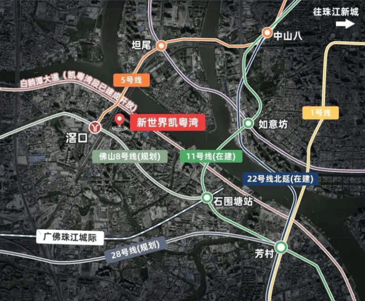 坐享白鹅潭江岸头排风口的新世界凯粤湾,不止于共享城市发展成果,同样主动共融于城市前进步伐——通过社区“私家空中连廊”,让业主几分钟即可风雨无阻、无缝搭乘地铁5号线首发站滘口站,可轻松接驳6号线、11号线等多条地铁干线,快速通达全城。