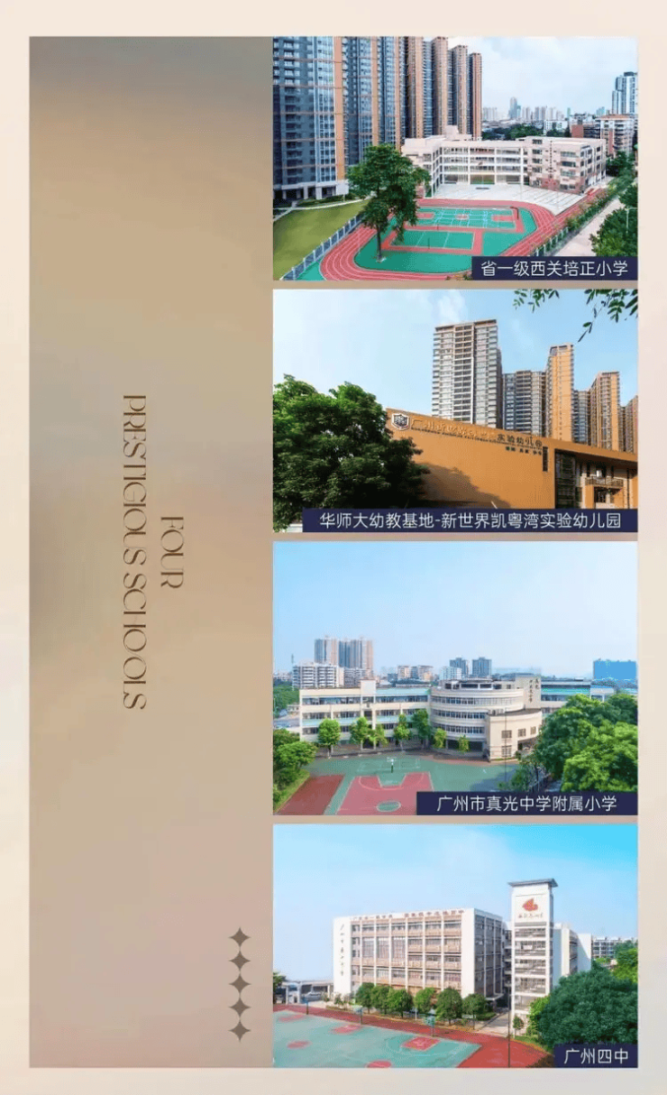教育方面,项目同样引入华师大幼教基地新世界凯粤湾实验幼儿园、省一级西关培正小学,邻近的公办学校广州四中新世界校区、真光中学附属小学等名校,现均已全部投入使用。