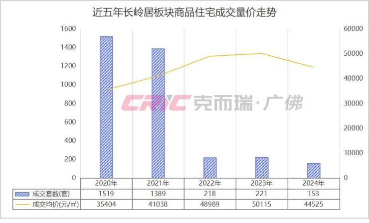 克而瑞数据监测显示,近一年长岭居商品住宅成交153套,成交均价42583元/㎡,