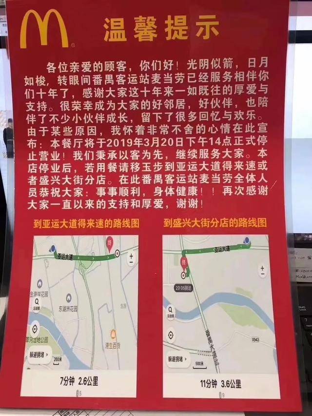 不知道大家对番禺客运站的印象如何?那十年如一日的麦当劳24小时灯火通明,迎接四房来客。而近日,番禺客运站麦当劳贴出公告,餐厅于2019年3月20日下午14点正式停止营业。