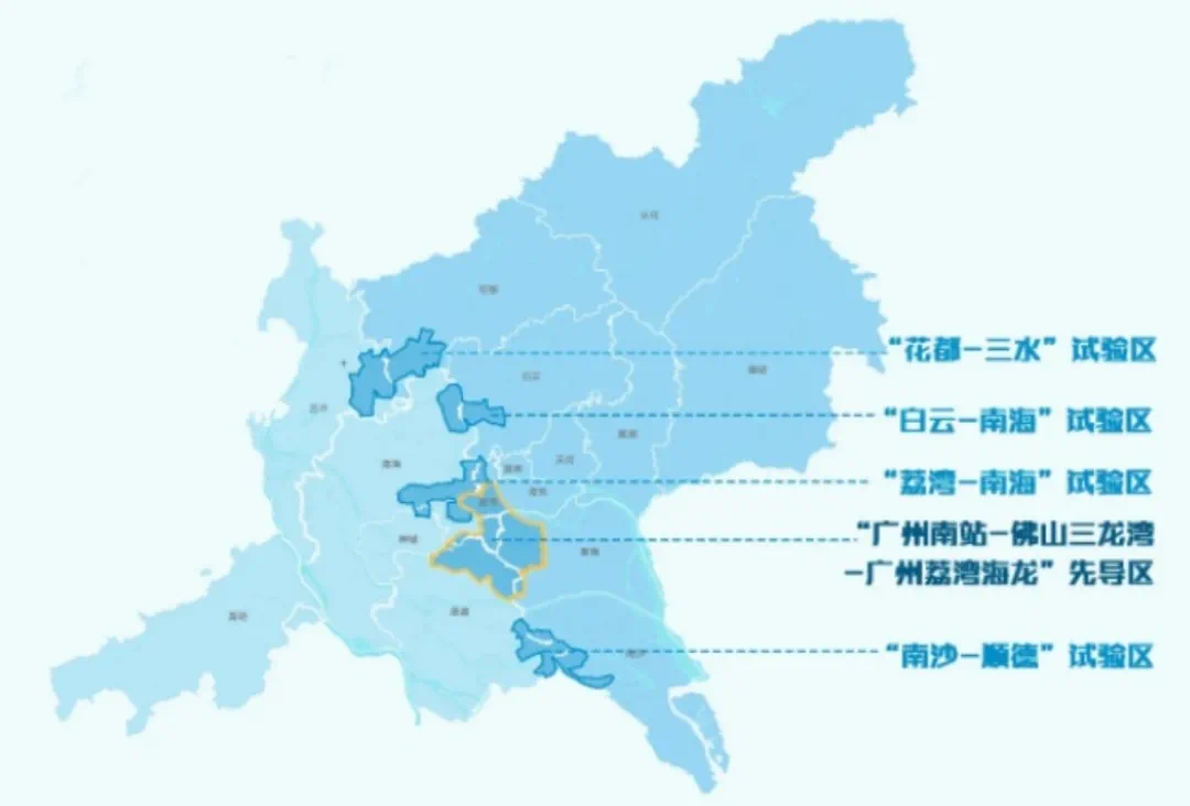 广州佛山这一次布局了“1+4”个合作区,总面积相当于深圳的1/3,包括“广州南站-佛山三龙湾-广州荔湾海龙”先导区、荔湾-南海”试验区、“南沙-顺德”试验区、“白云-南海”试验区、“花都-三水”试验区。